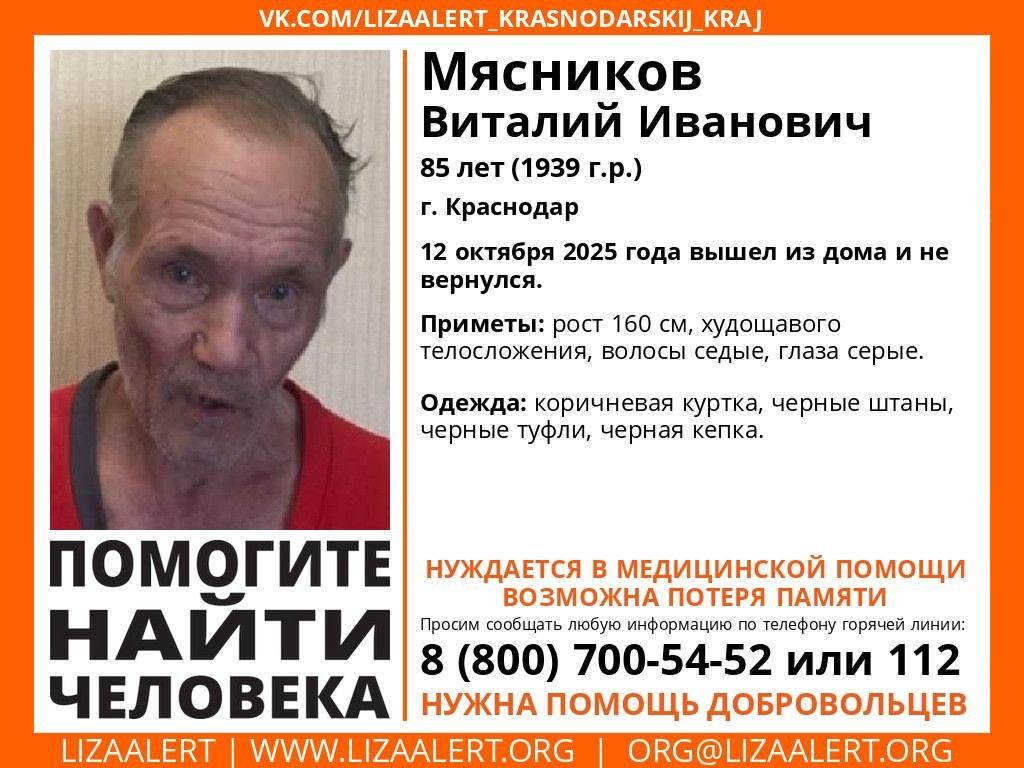В столице Кубани 12 октября пропал 85-летний Виталий Иванович Мясников. Он вышел из дома в неизвестном направлении и бесследно исчез. Его поиски ведут сотрудники полиции, а также добровольцы поисково-спасательного отряда «ЛизаАлерт» Краснодарского края.