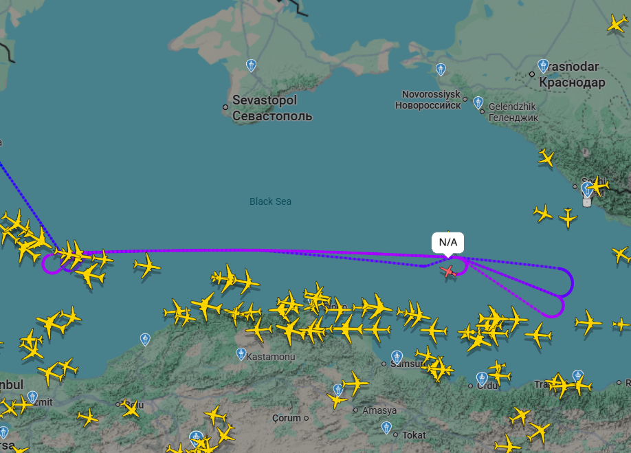 Самолёт, судя по карте, покинул аэродром в Румынии и двинулся вдоль турецкого побережья в сторону Краснодарского края и Абхазии. Затем он приблизился к Грузии, развернулся и полетел обратно. Таких кругов он сделал несколько.