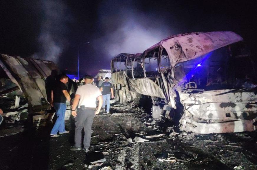 Сгоревший автобус и фуру уже потушили. Прокуратура организовала проверку по факту случившегося. Также на месте работают сотрудники Следкома.