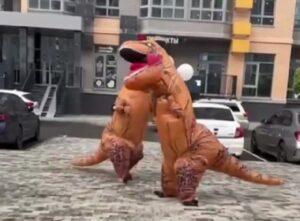 Жители многоквартирных домов на улице Мачуги в Краснодаре 13 октября наблюдали очень необычную картину: два человека в ростовых костюмах динозавров