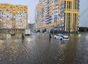 Минувшим вечером в посёлке Плодородный в Краснодаре во время дождя начало топить многоквартирную новостройку на улице Александра Сапрунова. Вода с