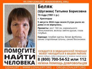 В Краснодаре к 6 августа продолжаются поиски Татьяны Беляк (Шугаевой). Об исчезновении пенсионерки Татьяны Борисовны Беляк (Шугаевой) 1951 года рождения