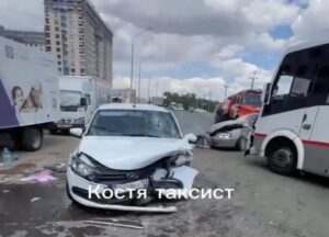 В Краснодаре возле Немецкой деревни утром 28 июня произошло массовое ДТП: столкнулись LADA Granta, Hyundai Accent и пассажирский автобус №83.