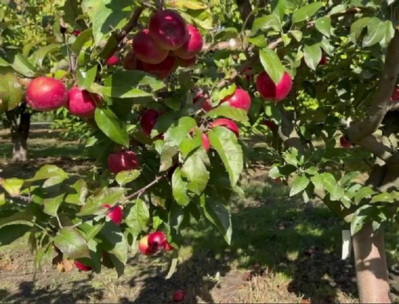 На кадрах видно ряды деревьев. Ветви ближайшей яблони усыпаны ярко-красными наливными плодами.