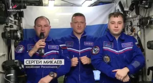 Космонавты «Роскосмоса» Сергей Кудь-Сверчков, Сергей Микаев — выпускник Краснодарского высшего военного авиационного училища летчиков и Олег Платонов с борта Международной