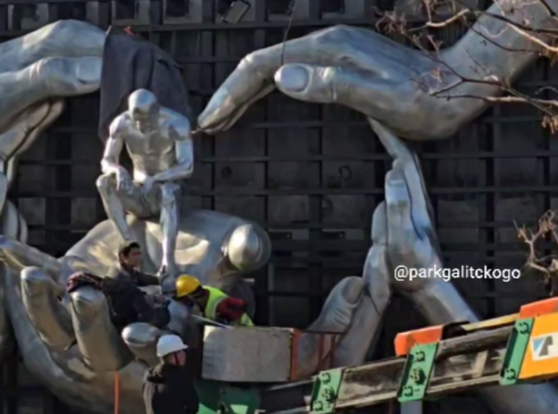 В парке Галицкого активно идут работы по установке нового арт-объекта, который поражает не только своей красотой, но и масштабом. Изначально это были руки в форме сердца, а 27 ноября в них появился силуэт мужчины.