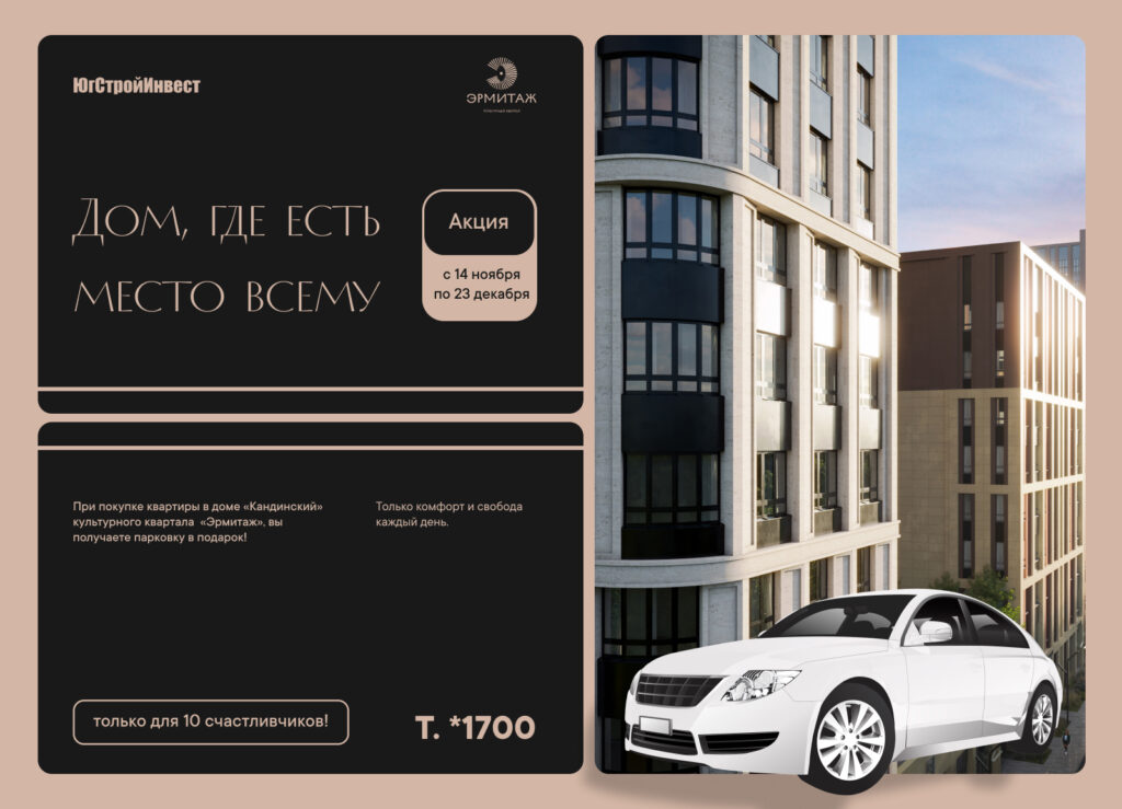 Группа компаний «ЮгСтройИнвест» объявила о старте выгодной акции в премиальном квартале «Эрмитаж». С 14 ноября по 23 декабря 2025 года покупатели квартир получают парковочное место в подарок.