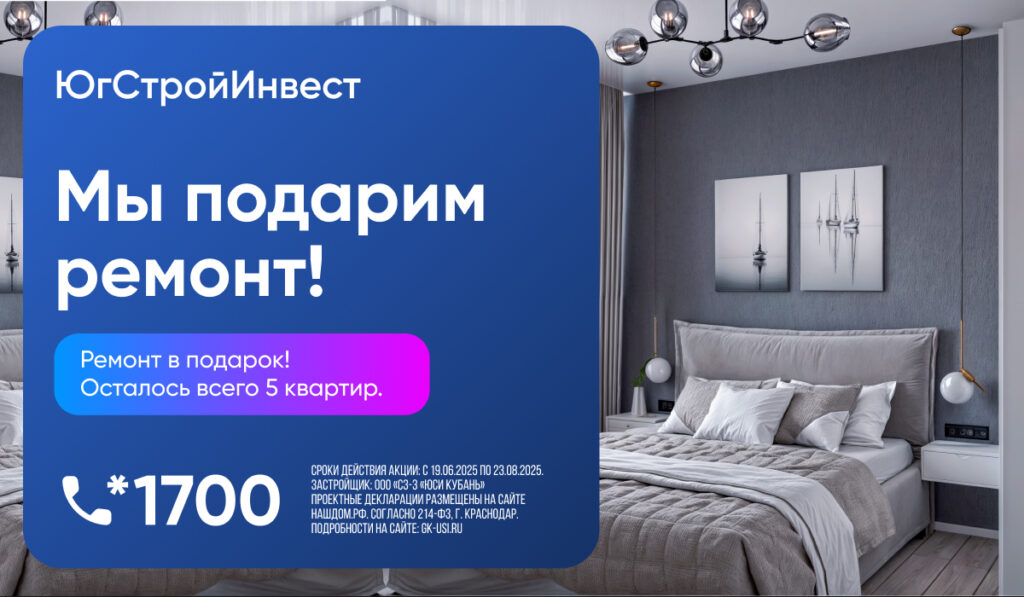 В семейном квартале «Достояние» такая возможность есть. ГК «ЮгСтройИнвест» запустила уникальную акцию: ремонт в подарок при покупке квартиры в ЖК «Достояние», в завершающем проект литере 22.