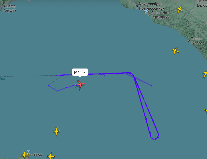 Воздушное судно Boeing RC-135U Combat Sent с позывным JAKE37 было замечено в небе над Чёрным морем в воскресенье. Это крупный самолёт радиоэлектронной разведки, который стоит на вооружении ВВС США.