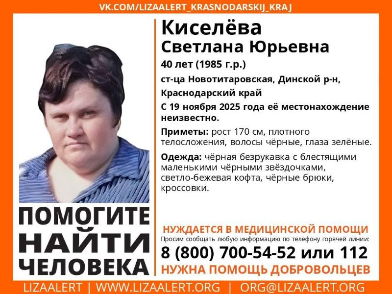 40-летняя Светлана Юрьевна Киселева пропала 19 ноября в станице Новотитаровская Динского района Краснодарского края. Она вышла из дома и бесследно исчезла.